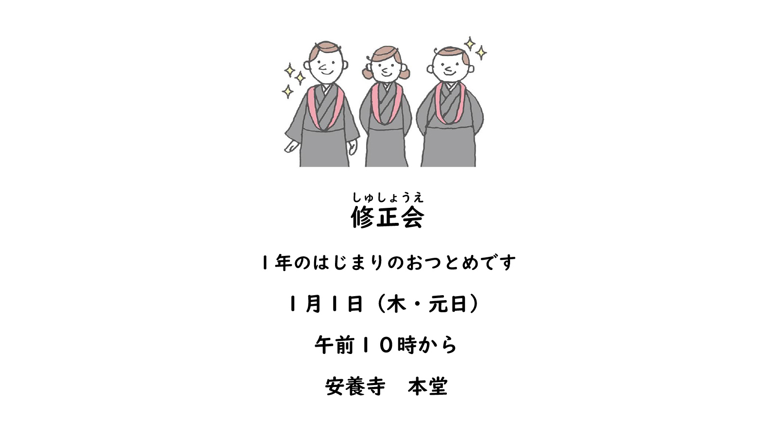1月1日(木)10:00から修正会(しゅしょうえ)をお勤めします。 開催情報 2025.12.25 1月1日10:00から修正会をお勤めします。 お寺でお参りをして清々しい一年のはじまりをむかえませんか。 お参りくださった方にはおさがりを用意しております。