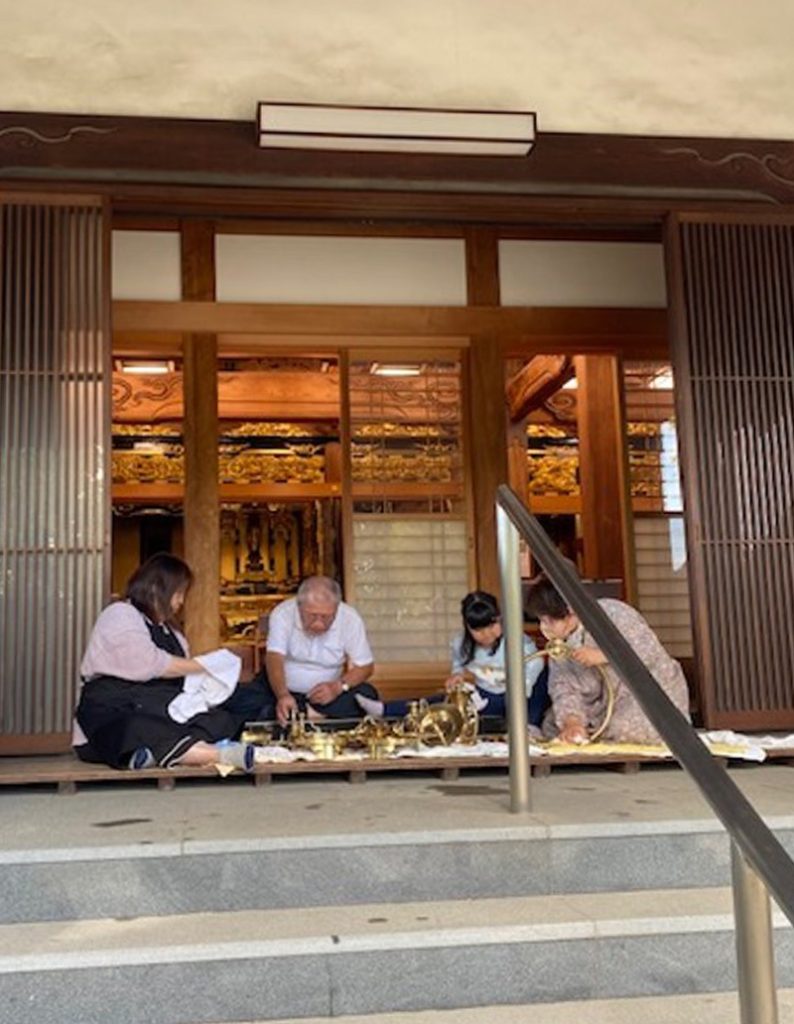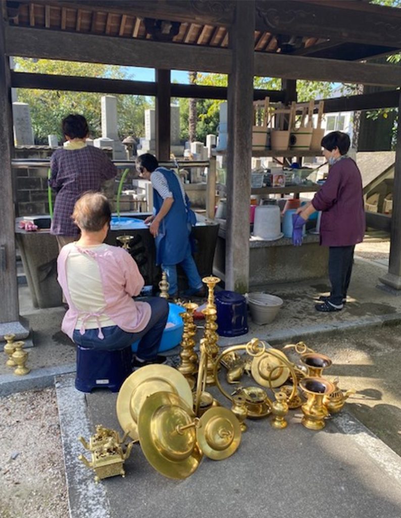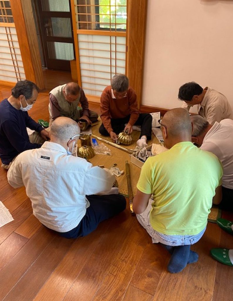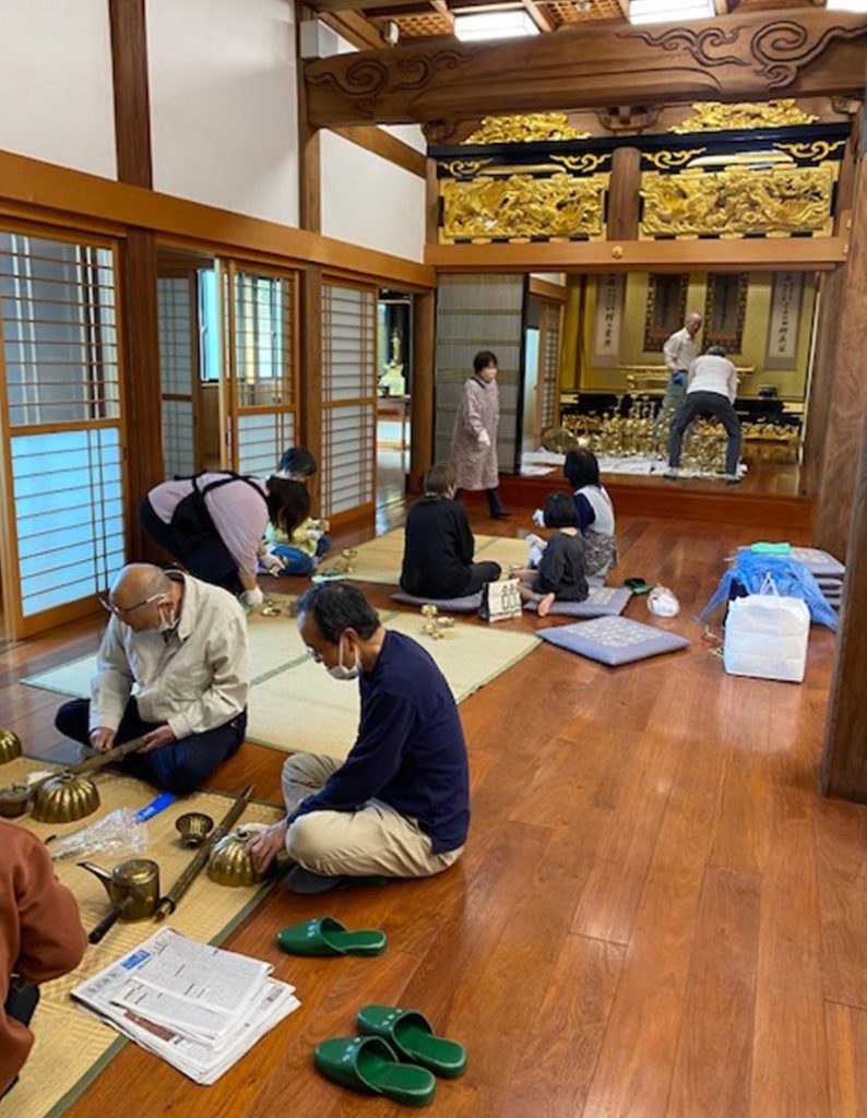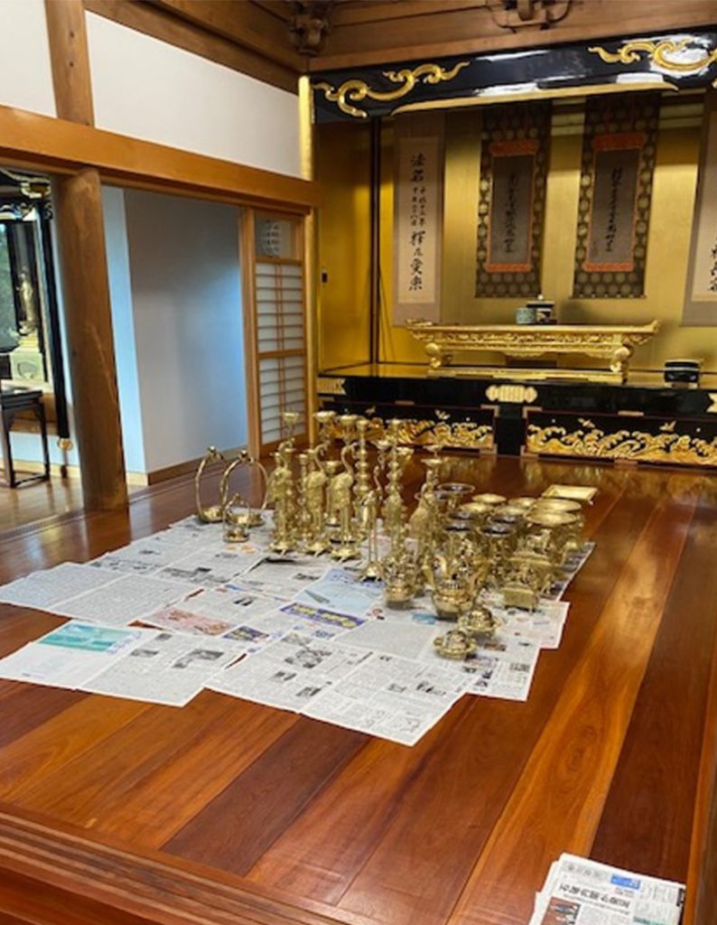 安養寺報恩講の準備で仏具をみがきました。 行事報告 2024.10.24 10月26日(土)27日(日)は安養寺報恩講です。 今週から準備が始まっています。 先日は、手伝ってくださる方たちとおみがき(仏具をみがく)でした。 報恩講の時にしか出さない仏具をみがきます。 ピカピカにきれいになりました。 様々な方が携わってお勤めされる報恩講に是非お参りください。